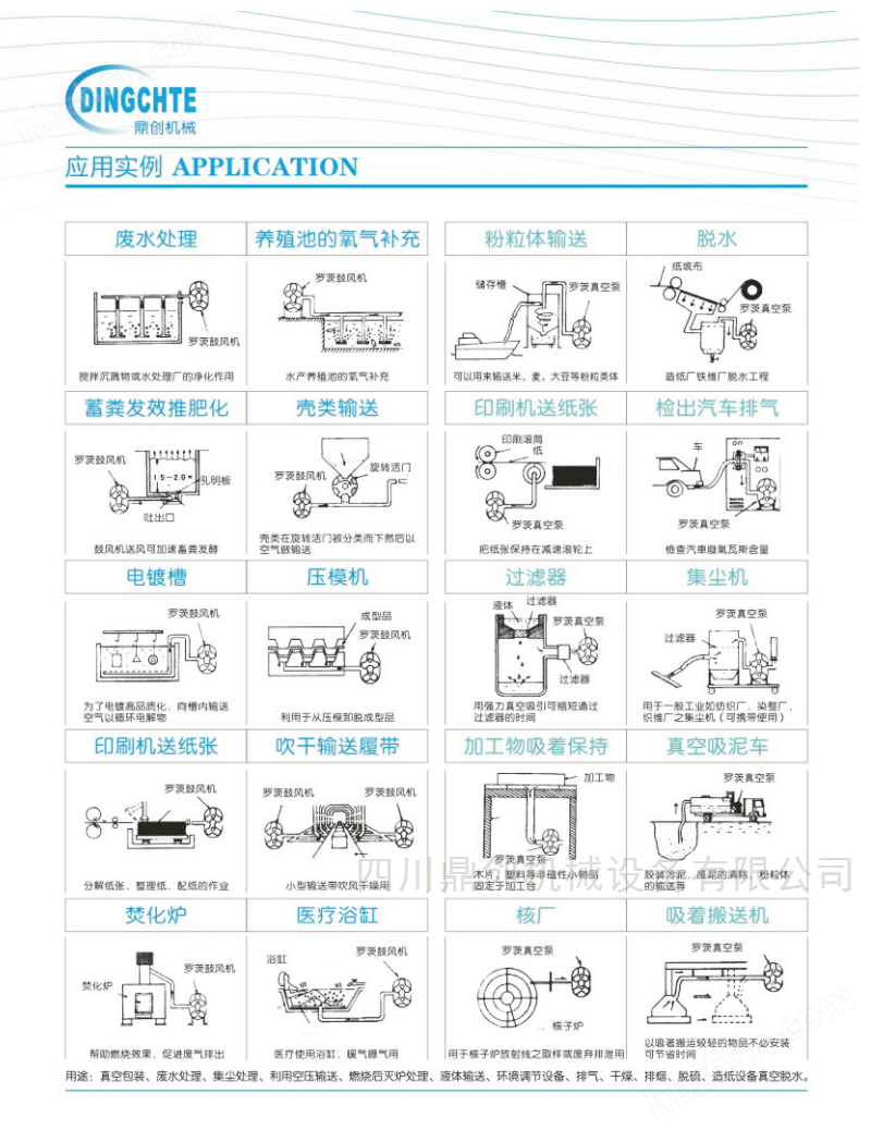 壓送用途:廢水處理曝氣,反沖洗,氣力輸送,風(fēng)刀烘干,水泥機械,造紙設(shè)備,化工等。